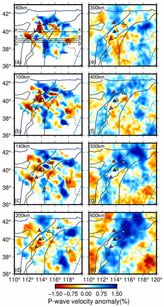 Map views of P-wave tomography at depths of (a) 60 km, (b) 100 km, (c) 140 km, (d) 200 km, (e) 300 km, (f) 400 km, (g) 500 km and (h) 600 km. The color bar is shown at the bottom. Blue solid lines show the NCC boundaries. Blue and black dashed lines mark the Tanlu fault and rifts, respectively. H1–H2: high-Vp anomalies; L1–L3: low-Vp anomalies. Colored triangles show the distribution of Cenozoic basalts (Figure 1). Black solid lines (AA’–DD’) indicate the locations of the cross sections shown in Figure 6.