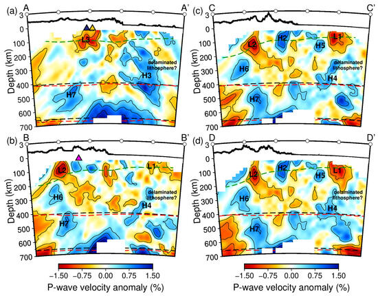 (a–d) Vertical cross sections of P-wave tomography, with their locations shown in Figure 5a. The surface topography is plotted on the top of each cross section. Colored triangles show the major magmatic centers in the area. Green dashed lines show the lithosphere–asthenosphere boundary (LAB, Zheng et al. [10]). Red dashed lines show the 410 km and 660 km discontinuities measured by Zheng et al. [10], and black dashed lines mark the locations of 410 km and 660 km discontinuities. The color bar is shown at the bottom. H2–H7: high-Vp anomalies; L1–L3: low-Vp anomalies.