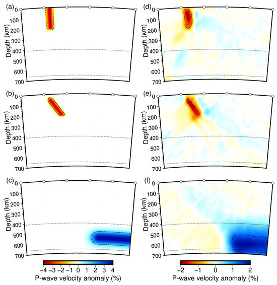 Synthetic resolution tests for P-wave model. (a–c) Cross sections of the input synthetic models. (d–f) Cross sections of the retrieved synthetic models. The color bar is labeled at the bottom. Black dashed lines mark the locations of 410 km and 660 km discontinuities.