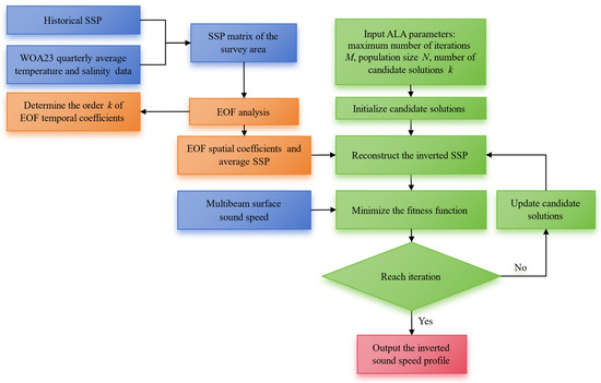 The flowchart of the SSP inversion method, combining WOA23 data and historical measured data. The blue flow chart shows the data preparation phase, the orange flow chart shows the EOF analysis results, the green flow chart shows the ALA algorithm optimization process, and the pink flow chart shows the resulting inversion sound speed profile.