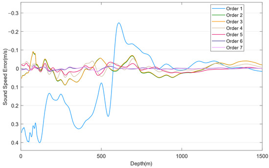 (2) Determination of EOF coefficient k: In order to reduce the order of time coefficients involved in the inversion of sound-speed profile and improve the efficiency of sound-speed profile inversion, the appropriate order k was determined by analyzing the variance contribution rate of the first seven orders of the EOF and the error of the reconstruction of sound-speed profile. The cumulative variance contribution rates of the first seven EOF modes are listed in Table 1, while the errors of the reconstructed SSPs are plotted in Figure 4.
