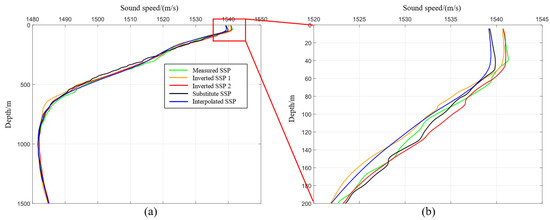 The result of the comparison between inverted and measured SSPs. (a) Four different methods used to retrieve the water depth profile structure. (b) Four different methods used to invert the water depth profile structure in the range of [0, 200] m. The green solid line is the actual measured SSP, the yellow solid line represents the SSP inverted using Inversion Method 1, the red solid line represents the SSP inverted using Inversion Method 2, the black solid line represents the substitute SSP, and the blue solid line represents the inverse distance-weighted SSP.