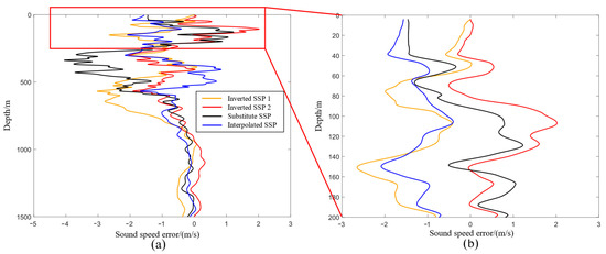 Errors in SSPs inverted by four different methods: (a) sound-speed error inversion of SSPs in the [0, 1500] m range; (b) sound-speed error inversion of SSPs in the [0, 200] m range. The yellow solid line represents the SSP inverted using Inversion Method 1, the red solid line represents the SSP inverted using Inversion Method 2, the black solid line represents the substitute SSP, and the blue solid line represents the inverse distance-weighted SSP.