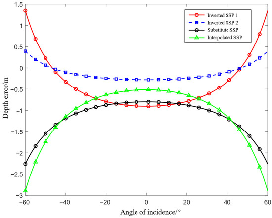 (6) Analysis of water depth error in the inversion of the sound-speed profile: According to the principle of constant gradient acoustic line-tracking, the multibeam echo time of the experimental water depth is obtained using the real sound-speed profile. The sound-speed profiles obtained by the four methods are followed by the constant gradient acoustic line-tracking according to the time, and the multibeam water depth-correction results of the different methods are obtained.