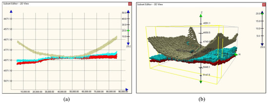 To verify the actual application effect of the method proposed in this paper on deep-sea measurements, historical multibeam data from a certain area in the northwest Pacific Ocean were selected for validation and analysis. Raw survey line files were imported and processed in CARIS HIPS and SIPS software (version 6.1). The results are shown in Figure 8. Figure 8a shows the multibeam bathymetric point data in 2D view and Figure 8b shows the multibeam bathymetric point data in 3D view.