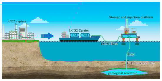 In the CCUS chain, carbon transportation plays a critical role. Currently, the main transportation methods for CO2 include tank truck transportation, pipeline transportation, and ship transportation. As the scale of CCUS projects continues to expand, the amount of CO2 requiring storage is also increasing. Many countries have turned to marine carbon sequestration, directly storing CO2 in seabed geological formations via submarine platforms or pipelines [2]. Liquid CO2 (LCO2) shipping has become an indispensable part of marine carbon sequestration due to its lower cost and higher flexibility than the pipelines, especially for long-distance marine transportation [3]. According to research by energy consultancy Rystad Energy, an estimated 55 dedicated transportation vessels will be required to meet the shipping demand for over 90 million tons of LCO2 per year by 2030 [4]. Several major CCUS projects are actively pursuing offshore CO2 storage and rely heavily on LCO2 shipping for efficient transportation to injection sites. For instance, Norway’s Northern Lights aims to store up to 5 million tons of CO2 annually in the Norwegian Continental Shelf using CO2 transportation vessels for delivery [5]. The UK’s Project Greensand plans to retrofit the Nini platform to store 1.5 million tons of CO2 per year in sandstone reservoirs 1800 m below the seabed [6,7]. Additionally, the Poseidon CCS project targets 40 million tons of annual storage capacity through offshore injection tests [8].