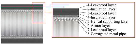 The structure of the reinforced corrugated hose mainly consists of an inner corrugated metal pipe, an armor layer, a helical supporting layer, an insulation layer, and a leakproof layer [15]. The inner corrugated metal pipe is located in the innermost layer of the hose structure and serves to resist internal radial pressure, preventing leakage of cryogenic liquid during operation. The armoring layer primarily bears the axial load during operation while also providing some insulation capability. The helical supporting layer, typically located outside the armoring layer, ensures the correct positioning of the armoring layer and provides some radial support. At least one insulation layer is required in the hose structure to prevent ice formation on the outside of the hose and to maintain a stable internal temperature. The leakproof layer prevents the ingress of external seawater and the leakage of internal cryogenic liquid, and it also has leak monitoring capabilities. This type of hose has a high bending stiffness, with a larger minimum bending radius, offering excellent sealing and structural strength. The structure of the reinforced corrugated hose is shown in Figure 2.
