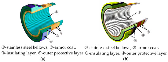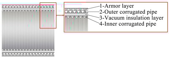 According to the EN 1474-2 standard [15], there are two main types of cryogenic hoses currently in use for LNG transfer: metal corrugated cryogenic hoses and polymer composite cryogenic hoses. Among these, metal corrugated cryogenic hoses can be further divided into the reinforced corrugated hose and the vacuum-insulated corrugated hose.