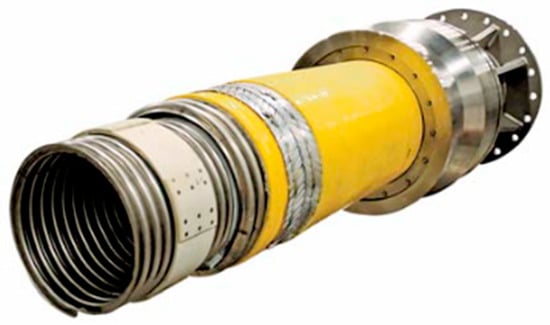 Vacuum-insulated corrugated hose by Nexans. Reproduced with permission from Eide, J., Bernson, M., Haakonsen, R., and C. Frohne. Challenges and Solutions in the Development of a Flexible Cryogenic Pipe for Offshore LNG Transfer. Paper presented at OTC Brasil, Rio de Janeiro, Brazil, October 2011. DOI: 10.4043/22393-MS. © 2011 Offshore Technology Conference. All rights reserved.