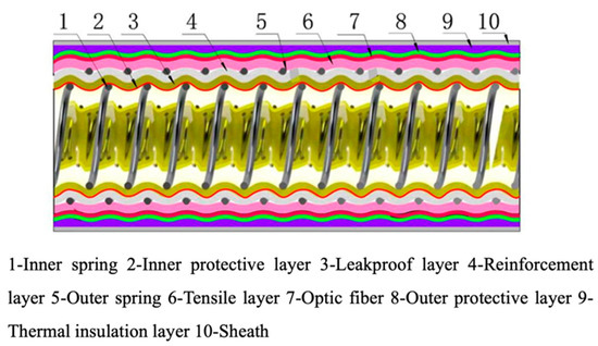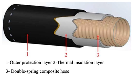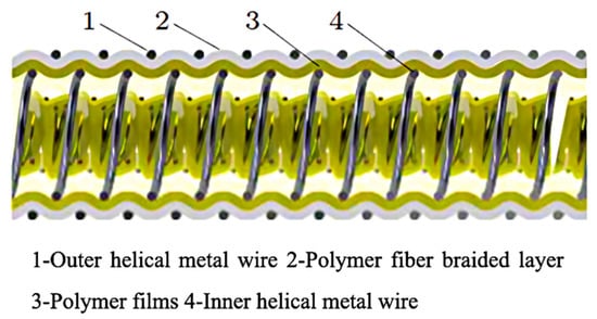 The composite cryogenic hose differs from the two aforementioned types of cryogenic hoses, as it features multiple layers of polymer films and a polymer fiber braided material, which are wound and fixed in place by a double-spring structure formed by inner and outer helical metal wires, creating a sealed tubular structure [15]. The polymer film layer effectively prevents leakage of cryogenic liquid during the transmission process, while the polymer braided layer provides radial and axial strength to the hose. The double-spring metal wire structure on the inside and outside enhances the strength against internal pressure, while allowing great flexibility. The structure of the composite cryogenic hose is shown in Figure 7.