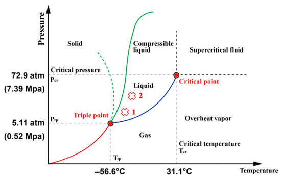 During the transportation of LCO2, it is crucial to regulate the temperature and pressure inside the hose to prevent vaporization, which could cause a rise in internal pressure and compromise the hose’s structural integrity. The phase diagram of CO2 is shown in Figure 10. At atmospheric pressure, CO2 exists in a solid state when the temperature is below −78 °C. The triple point occurs at a temperature of −56.6 °C and a pressure of 0.518 MPa, which corresponds to 5.11 atm. The critical temperature is 31.1 °C, with a pressure of 7.39 MPa, equivalent to 72.9 atm. Under atmospheric pressure, CO2 cannot exist in a liquid state; as the temperature increases, it sublimates directly from solid to gas [27].