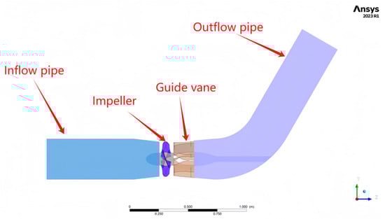 This paper focuses on a hydraulic model of an axial flow pump with a specific speed of 800. As shown in the three-dimensional schematic diagram in Figure 1, the main design parameters of the axial flow pump are as follows: the design speed is 1450 r/min, and the design head is 6 m. The impeller diameter is 300 mm, and the tip clearance is 0.2 mm. The impeller adopts a four-blade structure, and the guide vane section is configured with 7 blades.