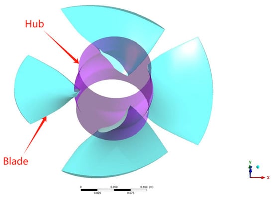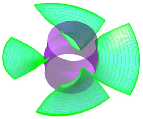 Prior to mesh generation, preprocessing of the geometric data of the rotating machinery is required. This paper simplifies the rotating machinery into three main components: the hub, blades, and casing. Based on axial-flow pump design principles [], a four-blade configuration was adopted. This design achieves optimal flow stability while effectively minimizing vortex-induced losses and flow resistance, thereby enhancing the pump’s hydraulic efficiency. This paper defines the rotational axis as the z-axis and sets parameters such as the geometric file sources, coordinate systems, and line types for the hub, casing, and blades. Considering the adjustable blade angle characteristic of axial flow pumps during operation, a reasonable tip clearance is set between the impeller blades and the casing []. By editing the topology settings, the geometric model is approximated using a topological structure, and local mesh refinement is applied to key regions such as boundary layers and flow separation zones, thereby optimizing the mesh structure and enhancing the accuracy of fluid simulations (see Figure 3, Figure 4 and Figure 5).