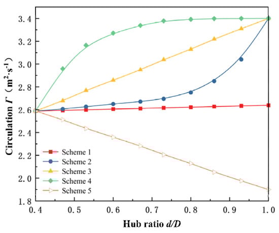 Because the velocity distribution on the impeller is different, different impeller design methods can be obtained. At present, the design of an axial flow pump is basically based on equal circulation design, and its airfoil on each flow surface produces the same pump high. Based on the design law of equal circulation, this paper will adopt the design method of variable circulation for axial flow pump, and the circulation Γ will change regularly by changing according to it. For the variable circulation design method [], the most important thing is to change the circulation distribution along the radial direction according to the actual flow situation in the axial flow pump; that is, the load at the hub and rim of the blade is small and the load at the middle of the blade is larger than that at the outer edge. Therefore, this paper will artificially change the distribution on the impeller, control the change of circulation γ, and make its corresponding theoretical head increase along the radius.
