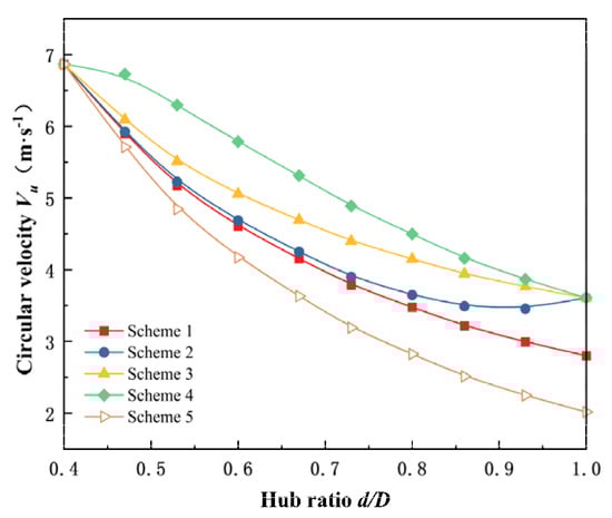This study investigates the influence of variable circulation design on the performance of an axial flow pump. Numerical simulations were conducted for five comparative schemes based on the same design operating point. From the hub to the shroud, a radial cross-section was selected at intervals of every 0.06 radius, resulting in a total of 10 sections. The design parameters of each section were substituted into fluid dynamics equations for calculation, ultimately obtaining the velocity fields and corresponding circulation values for each section. Based on these results, the radial distribution curves of circulation and circumferential velocity variation were plotted, as shown in Figure 6 and Figure 7.