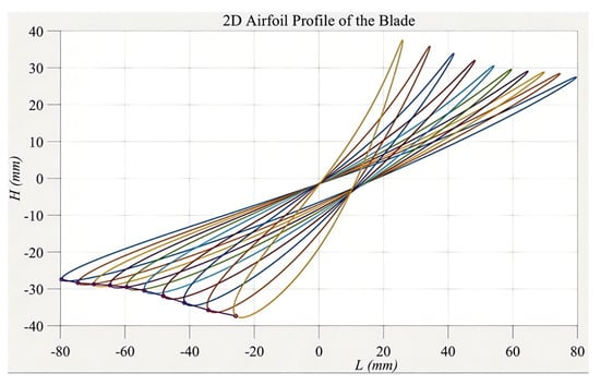The design schemes were constructed as follows: Scheme 1 employs conventional constant circulation design as the baseline reference; Schemes 2–4 establish distinct circulation gradient distributions—Scheme 2 features a nonlinearly increasing gradient along the radial direction, while Scheme 3 demonstrates a linear increasing gradient; Scheme 4 exhibits a nonlinearly decreasing gradient, all maintaining identical circulation values at the blade tip; and Scheme 5 adopts a linear decreasing gradient achieved through symmetric transformation of Scheme 3’s circulation distribution. By conducting coaxial comparative analysis of flow field characteristic curves from all five schemes, this research systematically reveals the influence patterns of different circulation gradient distributions on the hydraulic performance of axial flow pumps. Through importing numerical simulation results of all schemes into the MATLAB numerical analysis platform, three-dimensional blade geometries under different circulation distribution patterns were reconstructed based on parametric modeling methodology. Among them, Figure 8 displays the two-dimensional airfoil profile of the blade for the typical case (Scheme 3). By comparing the spatial surface characteristics of the blades under different circulation distribution patterns, this provides a visual analytical basis for optimized design.