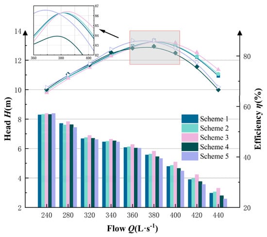 Based on the aforementioned scheme, this paper plotted the flow–head characteristic curves and flow–efficiency relationship curves under different circulation designs, with the specific results shown in Figure 10.