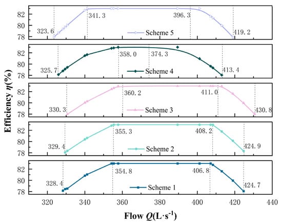 The efficiency–flow rate curves display a unimodal characteristic, characterized by a gradual increase followed by a rapid decline. The peak efficiency values of the conventional schemes are concentrated near the design condition (380 L/s), with Schemes 1–3 achieving peak efficiencies exceeding 85%. The efficiency curves of Schemes 1–3 exhibit similar trends below the design flow rate, while Scheme 3 achieves the highest efficiency under high-flow-rate conditions. Scheme 4 shows lower efficiency at both the design and high flow rates but demonstrates slight advantages in low-flow-rate regions. The reverse-designed Scheme 5 (featuring concave blades) shifts its peak efficiency toward low-flow-rate zones due to altered flow field characteristics.
