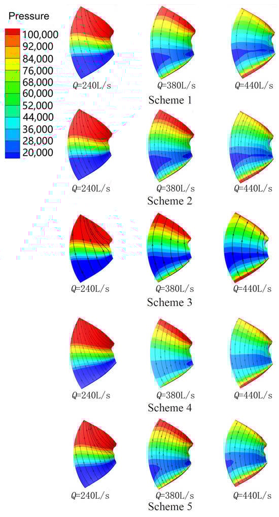 This paper selects three characteristic flow conditions (Q = 240 L/s, 380 L/s, and 440 L/s, corresponding to 0.6 Q, Q, and 1.2 Q, respectively) for comparative analysis. Figure 11 illustrates the pressure distribution on the back of the impeller, the velocity field distribution, and the hub-to-shroud streamline distribution characteristics under each condition. The pressure field analysis results indicate that under low-flow conditions, the inlet region exhibits a significant high-pressure characteristic, while the pressure in the outlet region decreases markedly, leading to an increased pressure difference between the inlet and outlet. Although this enhances the head characteristics, it causes the operating point to deviate from the design point, reducing operational efficiency. Under both the design flow and high-flow conditions, the pressure distribution shows a decreasing trend from the sides of the blade toward the center. The high static pressure maintained in the inlet region on the back of the impeller helps suppress cavitation, while the high velocity and uniform pressure distribution in the central region of the impeller ensure stable flow. The slight pressure reduction in the outlet region reflects the conversion of kinetic energy to pressure energy. Additionally, the significant pressure difference between the high-pressure zone at the leading edge and the low-pressure zone at the trailing edge of the blade provides the primary driving force for fluid flow.