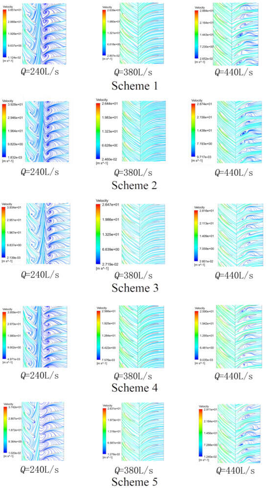 Under the condition of equal hub ratio design, Scheme 4, despite having the largest velocity circulation distribution, theoretically achieves the optimal match between flow rate and head at the design condition (Q = 380 L/s), maintaining a smooth flow state as the fluid passes through the guide vanes. This effectively suppresses turbulence and flow separation, resulting in superior head characteristics. However, a comparative analysis of guide vane hydraulic loss across different schemes reveals that Scheme 4 exhibits the highest guide vane hydraulic loss at the design condition, leading to an actual head lower than the theoretical expectation. This phenomenon can be attributed to the following factors: First, there is a mismatch between the geometric design parameters of the guide vanes and the inflow angle of the fluid, causing flow separation and vortex generation, which increases energy losses. Second, deviations exist between actual operating conditions and theoretical design parameters, including changes in fluid properties, fluctuations in inflow conditions, and other uncontrollable factors. These factors may collectively contribute to increased hydraulic losses in the guide vane section, ultimately affecting the overall performance of the axial flow pump.