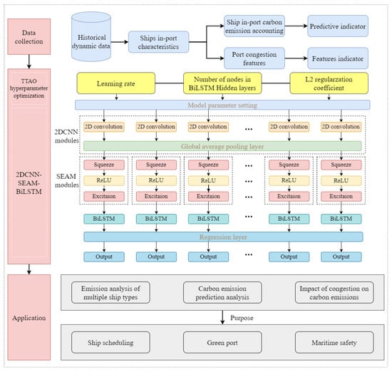 The TTAO-2DCNN-SEAM-BiLSTM model is sequentially constructed, using the in-port features of container ships as the input vector for the combined prediction model, and the in-port carbon emissions as the output prediction value. The overall prediction process is as follows: