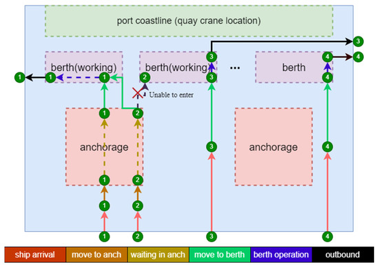 For dynamic ship flows, capturing the spatial activities of ships over time within the port is essential. Figure 2 illustrates the sequence of operations from arrival to departure. Ship 1 depicts the operational workflow of a ship when the berth is occupied. In contrast, Ship 2 must wait for the preceding ship to finish its operations due to type/size mismatch issues. Ship 3 demonstrates that the berth can support simultaneous operations for multiple small ships, while Ship 4 shows ships that can enter the berth directly without waiting for anchorage. The operational characteristics of ships are mainly defined by three factors: ship quantity, deadweight tonnage, and duration. Since the primary activity areas are anchorages and berths, analyzing resource utilization in these zones provides an effective measure of port congestion.