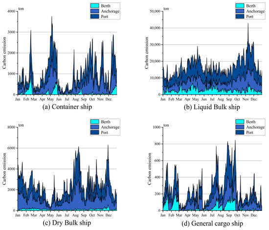 Figure 3 presents the overall in-port carbon emissions of ships. Our numerical analysis indicates that these emissions closely equal the combined outputs at anchorage and berth. Notably, during port congestion, the impact on total emissions remains minimal due to restricted cruising speeds, a low main engine load factor, and the short transit between anchorage and berth that reduces engine output.