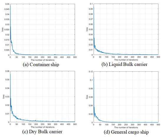 Convergence of training loss versus iteration number during the prediction model’s learning process for different ship types.