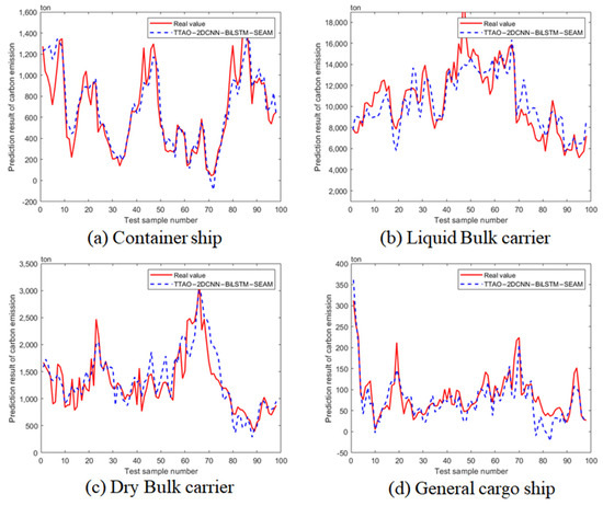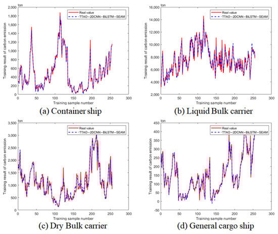The TTAO-2DCNN-SEAM-BiLSTM model exhibits exceptional fitting performance on the training set, underlining the model’s training efficiency, as illustrated in Figure 5. For container ships, the model achieved an impressive value of 0.99515, indicating a near-perfect fit. This suggests that carbon emissions for this category can be reliably predicted, as the data points closely align with the fitted line. This exceptional performance underscores the model’s ability to capture the variability inherent in container ship emissions. The result for liquid bulk carriers, with a commendable value of 0.97714, also demonstrates substantial accuracy, albeit slightly lower than that of container ships. This is indicative of the model’s effectiveness in capturing the unique dynamics impacting these ships, particularly the nature of their cargo. Similarly, dry bulk carriers show an value of 0.97246. Although the fitting is marginally less precise than that of other ship types, the model still showcases strong generalization capabilities. Here, carbon emissions are influenced by variables such as cargo type and voyage distance, which the model adeptly accommodates despite the added complexity. General cargo ships recorded an value of 0.98895, reflecting excellent fitting performance and ranking just behind container ships. The diversity of cargo in this category introduces additional variability in emissions; however, the model successfully navigates these complexities, reinforcing its robust predictive aptitude.