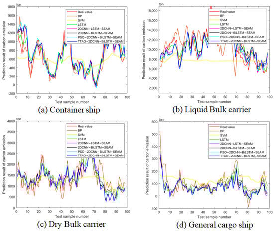 Prediction results and evaluation metrics are summarized in Table 2 and Table 3, along with comparisons with several classic models from previous studies. The analysis shows that the BiLSTM model significantly outperforms the traditional LSTM model across all ship types—reducing and improving scores. For example, for container ships, BiLSTM achieves a 6.59% increase in and a 28.08% reduction in relative to LSTM. Furthermore, integrating 2DCNN and SEAM into the BiLSTM framework enhances predictive accuracy by enabling dynamic feature extraction and improved channel communication. For dry bulk carriers, the 2DCNN-SEAM-BiLSTM model reduces by 62.88% on the training set and 37.33% on the test set, effectively handling complex feature spaces. TTAO-optimized models outperform their PSO counterparts, with average improvements of over 6% in and nearly 10% in , underscoring TTAO’s advantage in tuning parameters for highly dynamic and nonlinear datasets. Additionally, incorporating congestion features into the TTAO-2DCNN-SEAM-BiLSTM framework yields substantial benefits—a 27.85% reduction in for general cargo ships—highlighting the importance of real-time traffic conditions in carbon emission predictions. Notably, prediction discrepancies exist among ship types; general cargo ships exhibit lower accuracy due to operational complexity (e.g., multi-port logistics and diverse cargo handling), whereas liquid bulk carriers achieve higher accuracy because of their standardized operations and homogeneous cargo. These results emphasize the need for customizing prediction models to account for each ship type’s specific operational characteristics for optimal performance.