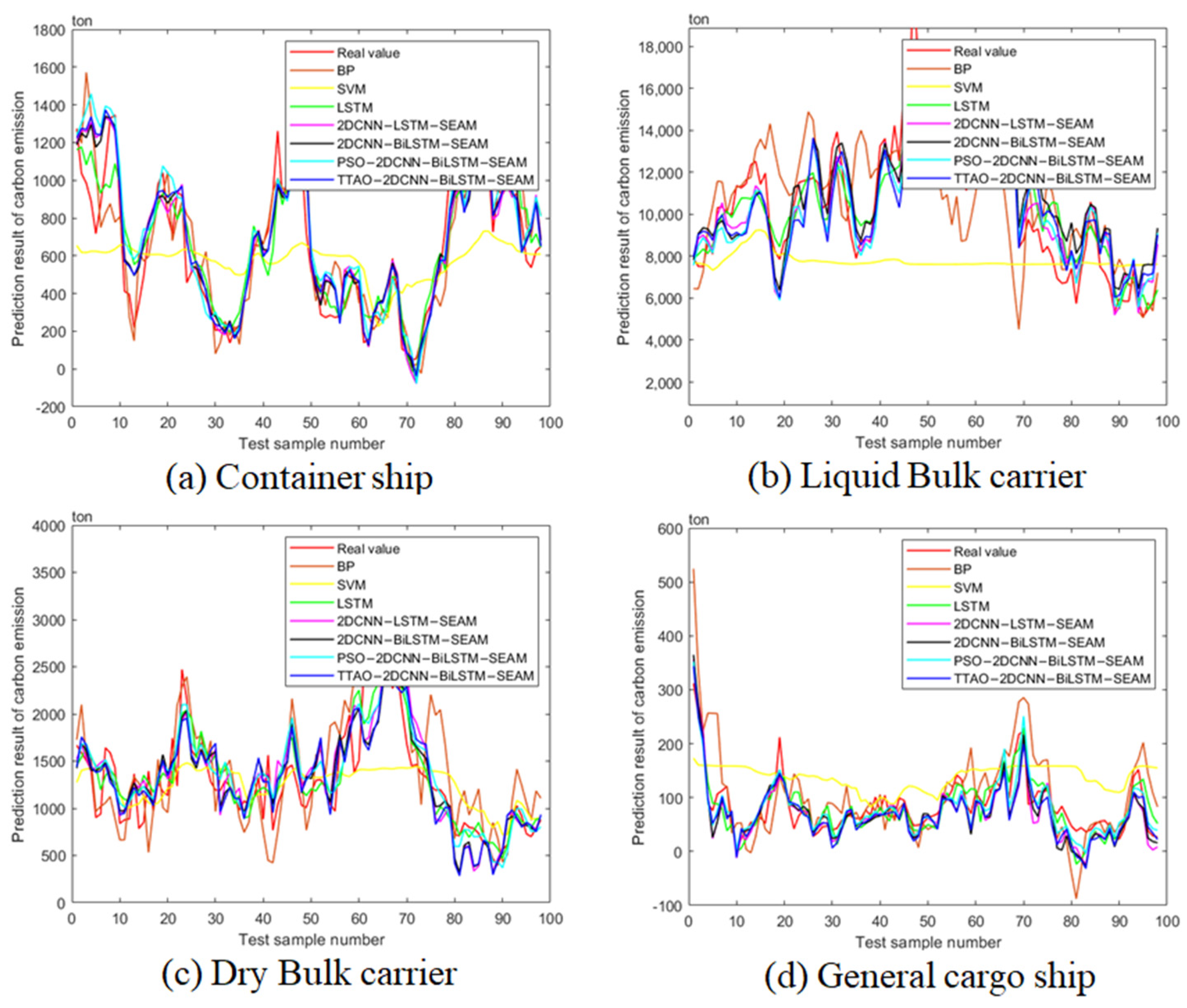 The comparative analysis of various predictive models for carbon emissions in shipping, as illustrated in Figure 7, reveals significant insights into the performance of the TTAO-2DCNN-BiLSTM model against traditional algorithms such as SVM and BP across different ship types. Each subfigure indicates that while SVM struggles with unrealistic negative predictions, particularly for liquid bulk carriers, the TTAO-2DCNN-BiLSTM model consistently provides stable and accurate results, indicating its robustness in capturing complex emission data. The model’s superiority is further emphasized in the contexts of container ships and dry bulk carriers, where it maintains lower error rates due to effective hyperparameter optimization through the TTAO approach. In general cargo ship predictions, the convergence of all models towards real emission values suggests a potential limitation in prediction complexity; however, the TTAO-optimized framework significantly enhances predictive accuracy. These findings highlight the need for advanced neural network methodologies and hyperparameter tuning in achieving reliable environmental predictions, calling for future research to explore dynamic operational data and additional ship classifications to further validate these advancements in sustainability efforts within maritime operations.