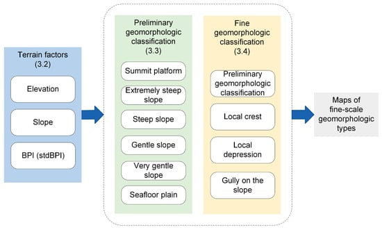 According to the definition in Table 1, the three topographic factors of elevation, slope, and BPI were selected to be used for the geomorphologic classification of guyots. The general classification idea was as follows (Figure 2): The DEM data of the guyots were input to extract the topographic factors. Subsequently, the preliminary geomorphologic classification based on elevation and slope yielded six geomorphologic regions, such as the summit platform, and the fine geomorphologic classification based on elevation, slope, and BPI yielded three geomorphologic types, such as local crest. Finally, these nine geomorphological types were plotted on the map, analyzed, and discussed. The relevant subsection headings are labeled in Figure 2.