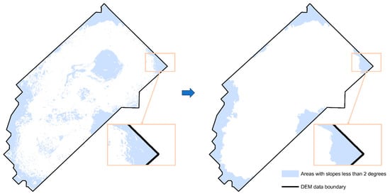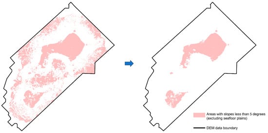 Extraction of seafloor plains. Areas with slopes less than 2 degrees that were not near the DEM data boundary were excluded, and small blank areas surrounded by areas with slopes less than 2 degrees were still identified as seafloor plains.