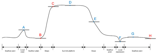 Guyots are distributed with obvious crested and depressed areas, which can be recognized by using stdBPI. Figure 6 shows a schematic longitudinal section of the seamount area, and the letters A to H denote local crests, feet of guyots, summit edges, summit platforms, uniform slopes, local depressions, seafloor plains, and the edge areas of DEM data, respectively. According to the BPI theory [31], the recognition results of these eight zones are shown in Table 3.