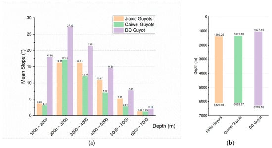 Morphological characteristics of (a) the mean slope of the distribution of guyots by depth and (b) guyot depth differences.