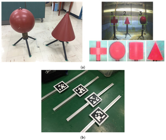 Artificial landmarks for AUV navigation. (a) Cylindrical landmarks for forward sensing. (b) Fiducial markers for downward sensing.