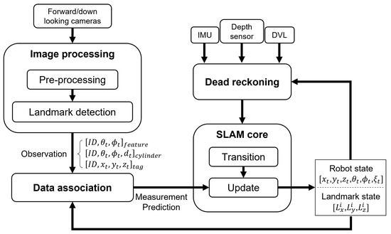 Figure 3 illustrates the overall framework of the proposed visual SLAM system. We have modules for AUV dead-reckoning, image processing, data association, and the SLAM core. In this work, EKF-SLAM [12] is utilized as the SLAM core. Although we have chosen the EKF, other SLAM methods could also be applied without loss of generality, as the same motion and observation models can be utilized. For instance, when implementing graph optimization-based SLAM, information from the dead-reckoning and image processing blocks can create constraints in the front end, while optimization in the back end can update the entire trajectories.