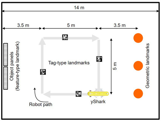 Experiments were conducted in a basin environment to validate the proposed SLAM method. Figure 4 illustrates the setup of the landmarks and path plans for the robot during the tests. We installed 4 tag-type landmarks and 3 cylindrical landmarks within the basin. Additionally, we placed two panels with various objects attached to serve as visual features. The yShark II, an AUV developed by the Korea Research Institute of Ships and Ocean Engineering (KRISO), was utilized in this experiment. The robot moved along the square (5 m by 5 m) path 4 times. Tag-type landmarks were observed from a down-looking camera (PointGrey Grasshopper3), and object panels and cylinder-type landmarks were observed from a forward-looking camera with the same model. Navigation sensors including the AHRS (Microstrain 3DM-GX3-25), DVL (LinkQuest NavQuest600 Micro), and depth sensor (Paroscientific Digiquartz) were used in the calculation of the DR estimation and SLAM prediction. All software for data acquisition, landmark detection, DR, SLAM, and vehicle control was developed in-house in C++.