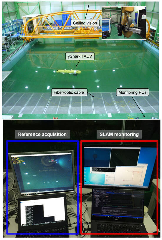 Testing setup. Top: Engineering basin located at Changwon National University with the yShark II AUV. Bottom: ground control station featuring a reference acquisition system and remote access to the AUV’s internal computer.
