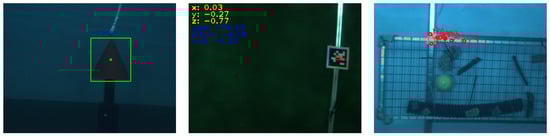 Underwater artificial landmarks and their detection results. From left to right: cylindrical landmarks, tag-type landmarks, and feature-based landmarks.