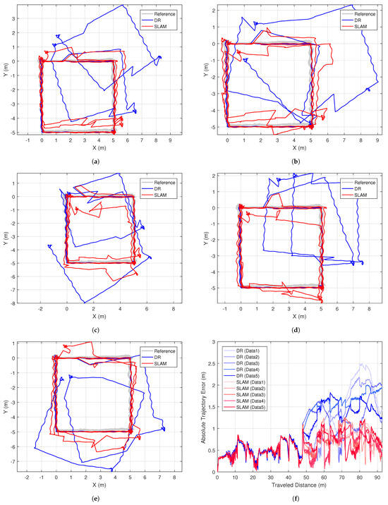 Results for all 5 datasets are shown in Figure 8. We applied different random noises for each dataset. Estimated trajectories and the absolute trajectory errors in Figure 8f support the superiority of the proposed SLAM method, which maintained the bounded errors throughout the entire trajectories. Table 1 summarizes absolute trajectory errors for DR and SLAM. The RMSE of the SLAM trajectory was 0.67 m for 92 m paths. This improved the positioning error of DR by 41.2%. Similarly, the maximum error was reduced by 43.6% when we used the SLAM.