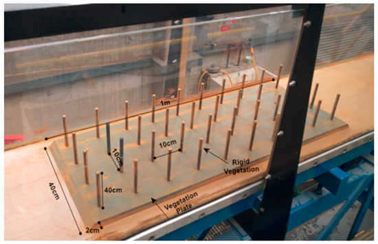 A vegetation plate was securely affixed to the flume bed. The plate measured 0.4 m in width and 1 m in length, with a thickness of 2 cm, and contained 40 rigid stems arranged in a grid with a centre-to-centre spacing of 10 cm. Each stem had a diameter (D) of 1 cm and a vertical length (L) of 10 cm, extending upward from the plate to simulate submerged vegetation. This results in a diameter-to-length ratio (D/L) of 0.1, as illustrated in Figure 2 and flow condition in Appendix A and Figure A1 and Figure A2. This clarification distinguishes the vertical stem length from the horizontal spacing between stems. This configuration was designed to represent the flow resistance and turbulence characteristics of natural aquatic plants in a simplified and controlled manner. The 2 cm thickness of the plate was selected to ensure structural stability and uniform stem anchoring. However, we acknowledge that this elevation may introduce a minor step at the leading edge, potentially causing a localised recirculation zone. This effect was minimised by ensuring a smooth transition between the flume bed and the plate edges. Additionally, velocity measurements in the upstream and inter-vegetation regions did not show significant anomalies attributable to plate-induced separation, indicating that its influence on the bulk velocity field was negligible. While natural aquatic plants exhibit a wide range of shapes, sizes, and flexibilities, the chosen diameter and length are within the range of values reported for various submerged plant species. For example, the stems of common aquatic plants like Elodea, Myriophyllum, and Potamogeton can have diameters ranging from a few millimetres to over a centimetre, and lengths ranging from a few centimetres to over a metre [23,24,25].