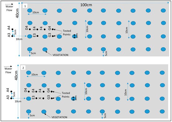 where represents the shear stress, is the fluid density, and is the time-averaged product of the fluctuating velocities in the axial and radial directions [30]. Two experimental scenarios were considered in this study to investigate the hydrodynamic effects of submerged rigid vegetation. The first scenario, referred to as Test 1, served as the benchmark, featuring a fully vegetated patch with 40 stems arranged in a uniform grid as shown in Figure 3. The second scenario, Test 2, explored the impact of removing one vegetation stem from the patch. The decision to investigate the removal of a single stem was made to simplify the analysis and isolate the effects of localised vegetation irregularities on flow behaviour. This case represents a common scenario in natural aquatic systems, where vegetation is not always uniform due to plant growth, physical disturbances, or mortality. Focusing on a single stem removal allows for a clearer understanding of the hydrodynamic changes caused by such disturbances without the added complexity of multiple gaps or large-scale changes in vegetation structure. Moreover, it is representative of disturbances that may occur naturally, where gaps in vegetation are typically isolated rather than widespread.