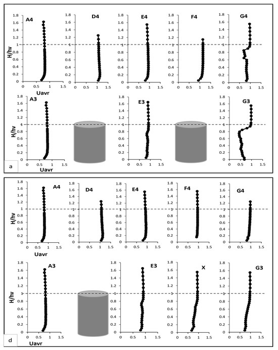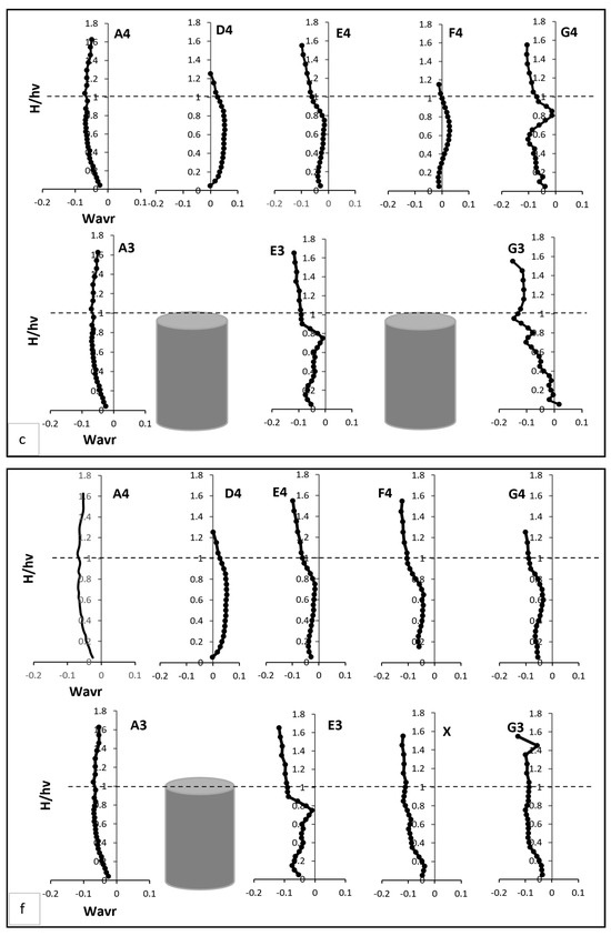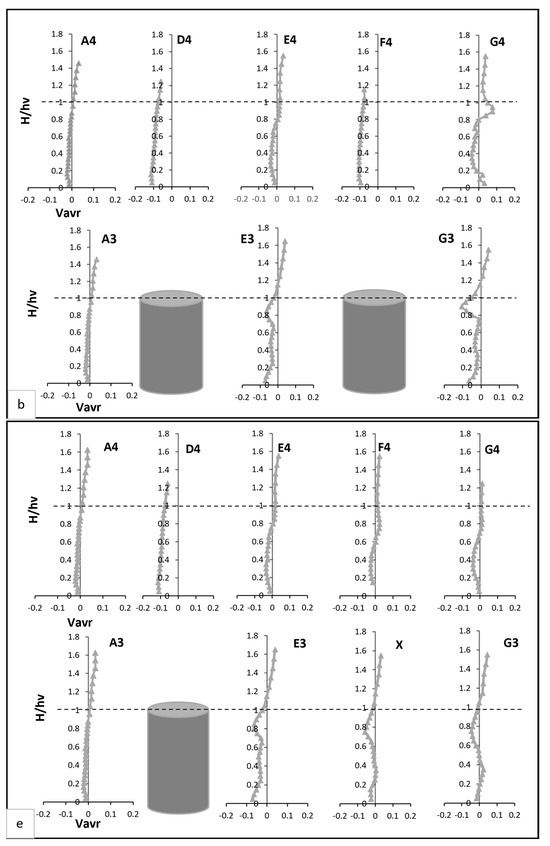 The removal of a single vegetation stem introduced a void at point X, significantly altering velocity profiles at X and surrounding points (E3, G3, D4, E4, F4, and G4), referring to Figure 4d. While no significant changes were observed at point E3 following the vegetation pitch removal, the void at point X and the behaviour at point G3 exhibited noticeable differences. At point X, the axial velocity increased slightly near the bed compared to E3 in Test 1. This reflected localised acceleration of flow through the unobstructed void. Higher in the water column, this effect diminished, with velocity stabilising near the top of the vegetation zone. At G3, the axial velocity demonstrated a tendency to recover, increasing to match the value at E3 without an inflexion point, as observed in Test 1. Initially, velocity decreased near the bed before increasing progressively until it matched the pre-vegetation value at the top of the vegetation height, stabilising thereafter towards the water surface. This behaviour is attributed to the disruption of uniform flow caused by the void. However, this reduction was confined to the under-vegetation region, with velocities above the vegetation recovering to Test 1 levels. At D4 and F4, axial velocity near the bed increased by 15–20%, reflecting redirected flow into the inter-vegetation regions. Above the vegetation, velocity stabilised in the outer flow region. At E4 and G4, changes were minimal, with slight reductions near the bed stabilising above the vegetation.