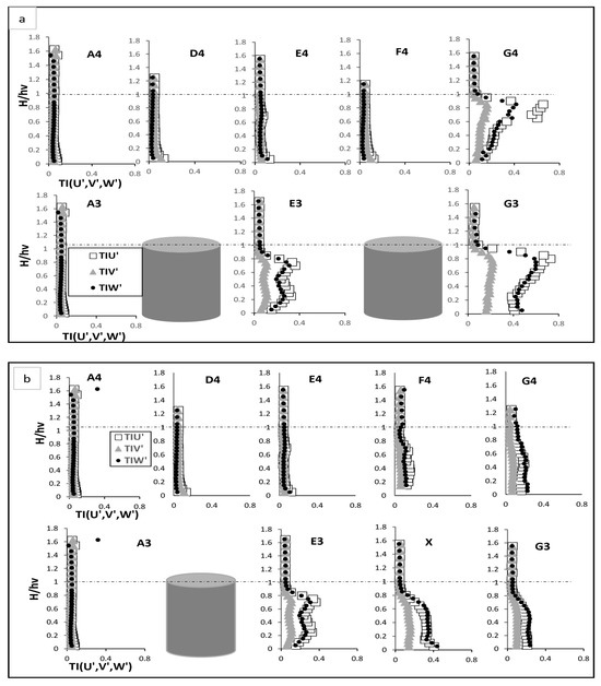 Turbulent intensity Test (a), fully vegetated, and Test (b) with one vegetation stem removed; the points shown in the figure (A3, A4, D4, E4, F4, G4, E3, and G3) are referenced in Figure 3.