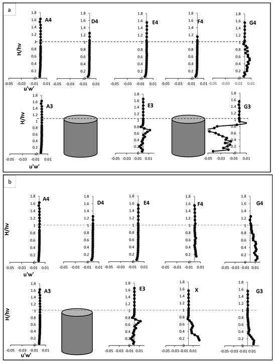 Reynold shear stress, Test (a) fully vegetated, and Test (b) with one vegetation stem removed. The points shown in the figure (A3, A4, D4, E4, F4, G4, E3, and G3) are referenced in Figure 3.