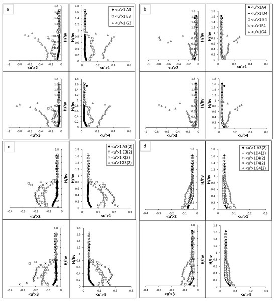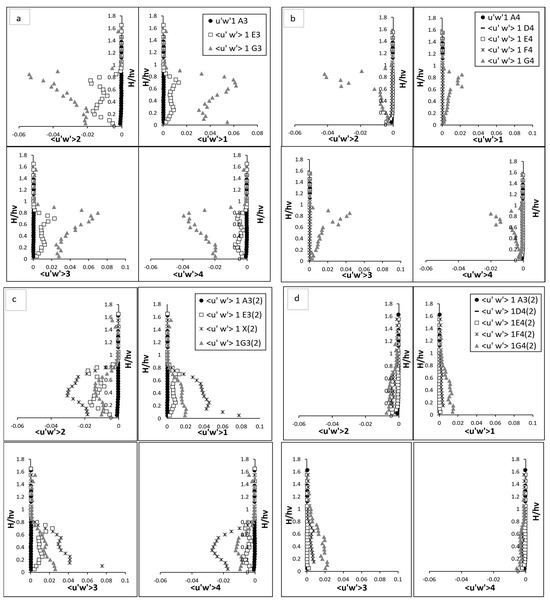 Quadrant analysis (Reynold shear stress), (a) vegetation line (A3, E3, and G3) for fully vegetated (b) between vegetation line (A4, D4, E4, F4, and G4) for fully vegetation test; and (c) vegetation line (A3, E3, X, and G3) for Test (2) with one vegetation stem removed and (d) between vegetation line (A4, D4, E4, F4, and G4) for Test (2) with one vegetation stem removed. The points shown in the figure (A3, A4, D4, E4, F4, G4, E3, and G3) are referenced in Figure 3.