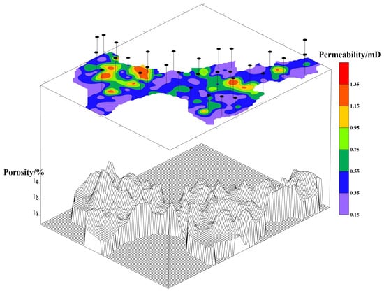 This study focuses on the ultra-low-permeability B9 Reservoir (this is a code name; as per the confidentiality agreement, the actual name of the reservoir and precise reservoir data cannot be provided), located in the Ordos Basin. The primary oil-producing layer is the Triassic Yanchang Formation, with an average burial depth of about 2000 m, an effective thickness of about 20 m, a reservoir pressure of about 15 MPa, and an original oil saturation of about 50%. The recoverable reserves are estimated at 4.8941 million tons, with an original reservoir temperature of 69.7 °C. The current development utilizes a diamond-shaped nine-spot well pattern, with a well spacing of 480 m and a row spacing of 130 m. The field currently operates 92 water injection wells and 258 production wells. The permeability and porosity of the reservoir exhibit significant spatial variations across the entire formation, with the porosity ranging from 8% to 16% and a permeability between 0.20 and 1.40 mD (Figure 1). The calculated permeability parameters include a coefficient of variation of 0.78, a breakthrough coefficient of 3.41, and a permeability ratio of 7. All wells underwent hydraulic fracturing prior to production to enhance the flow capacity. Prior to field testing, the B9 Reservoir was in the early stage of water flooding development, with a composite water cut of 42% and a recovery factor of 2.83%.
