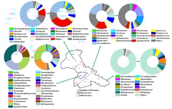 The unique microbial genera that were identified in the distal southeastern section of the field test area (Figure 2) include thermotolerant (Ilumatobacter) [], halotolerant (Salinibacterium) [], marine environment-specialized (Halomonas) [], and hydrocarbon-degrading (Novosphingobium, Holophaga, and Alkanindiges) species []. This may result from limited anthropogenic disturbance (Figure 2) and well-preserved original reservoir conditions [].