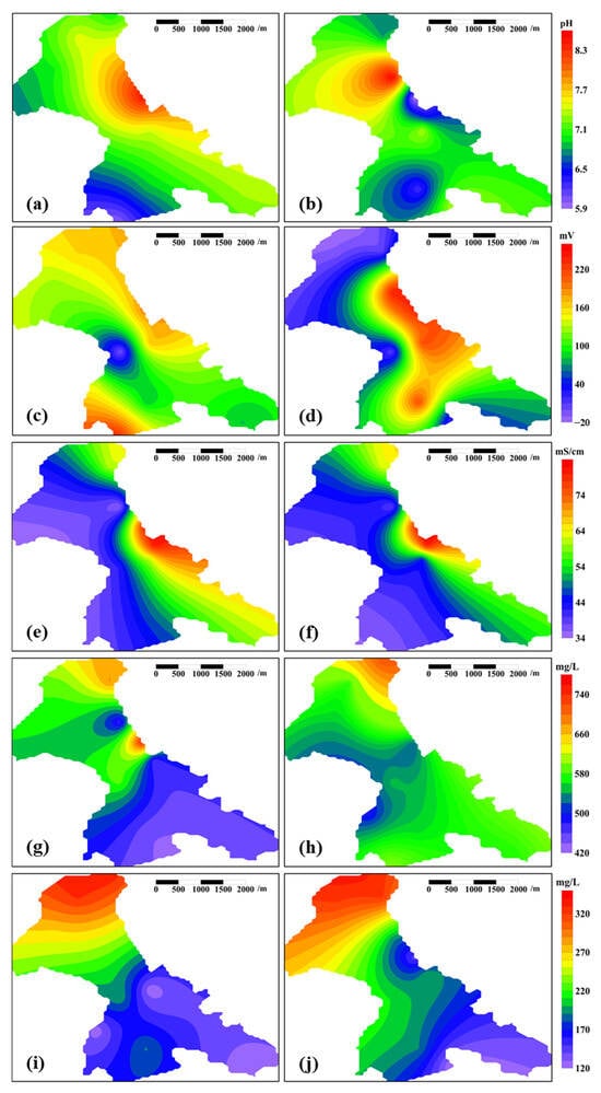 Heatmaps of environmental parameters across the entire B9 Reservoir pre- and post-field test. Note: (a) pH before the field test, (b) pH after the field test, (c) redox potential before the field test, (d) redox potential after the field test, (e) conductivity before the field test, (f) conductivity after the field test, (g) COD before the field test, (h) COD after the field test, (i) BOD before the field test, (j) BOD after the field test.